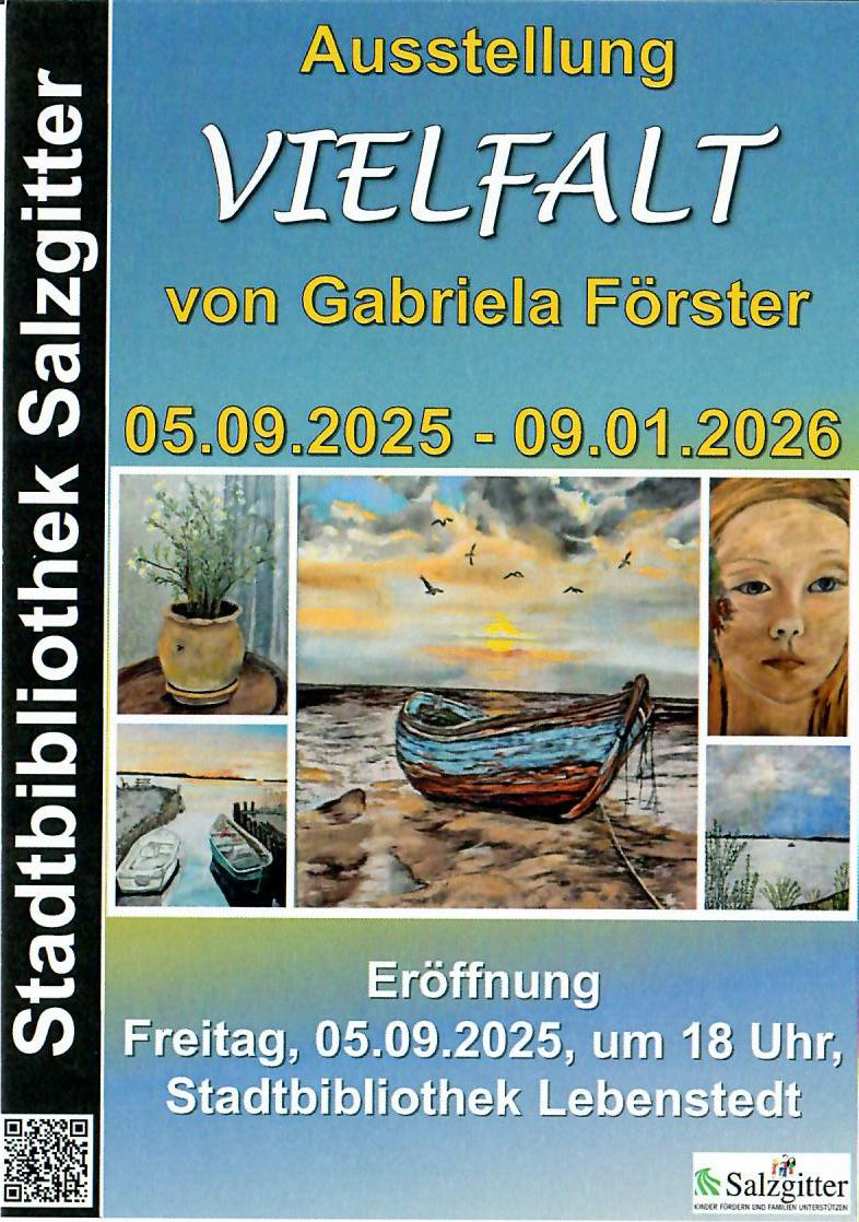 Am Freitag, den 5.9.2025 lädt Gabriela Förster zu ihrer Ausstellung in die Stadtbibliothek in Salzgitter Lebenstedt ein.